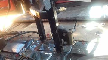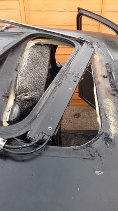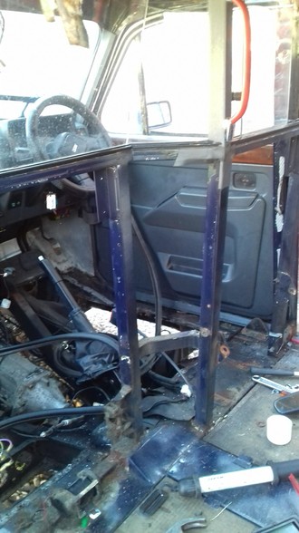 The first job was to remove the interior partition from my old taxi to fit in the new one which no longer had one.The partitions are heavy box section steel,they contribute to the strength of the vehicle and are welded to beams on the floor and in the roof.When in place the partition is part glazed,covered on the cab side in alloy sheet and to the rear with plastic mouldings. It carries fixings for the rear tip up seats and seat belts. I cut the partition as close as possible to match the remains of the partition left in the other taxi. |