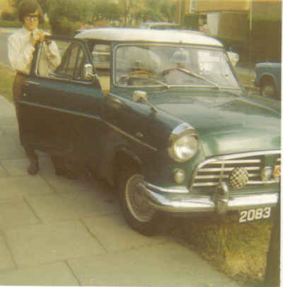 I was this smart looking young lad in the Buddy Holly glasses posing proudly beside his 1958 ford consul.I'd already treated it to a respray in Aquatic Jade and a fancy grill made from alloy strips.The padded spot lamp covers and badge bar are very 60's..Later the tops of a couple of scrap wings provided mounts for another pair of headlights on the top of the bonnet and some fancy stripes went on the side in olde english white to match the roof.