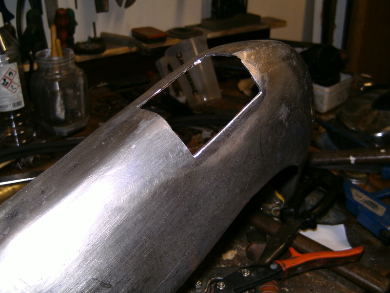 4.After grinding away the chrome a piece of flat steel is shaped to follow the bumpers curve,then cut out accurately so that it sits in the hole.